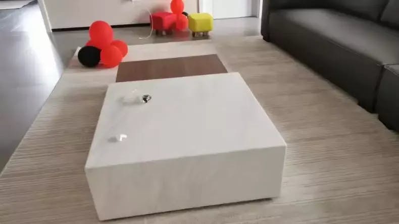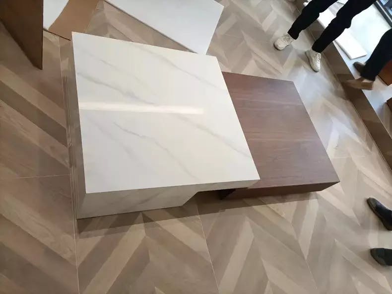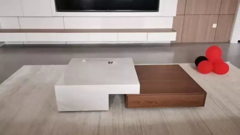 Palabras clave: mesa de centro de madera y mármol, mesa de centro minimalista, muebles modernos para sala de estar, mesa geométrica de lujo, mesa de nogal y mármol, mesa de centro asimétrica, muebles de diseño.