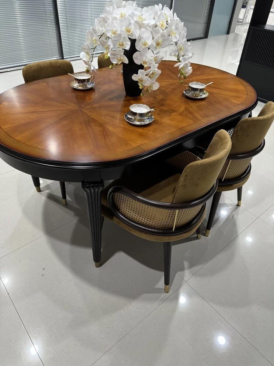 Keywords: cane-back dining chair, velvet dining chair, modern vintage chair, upholstered dining chair, black and gold dining chair, luxury seating.